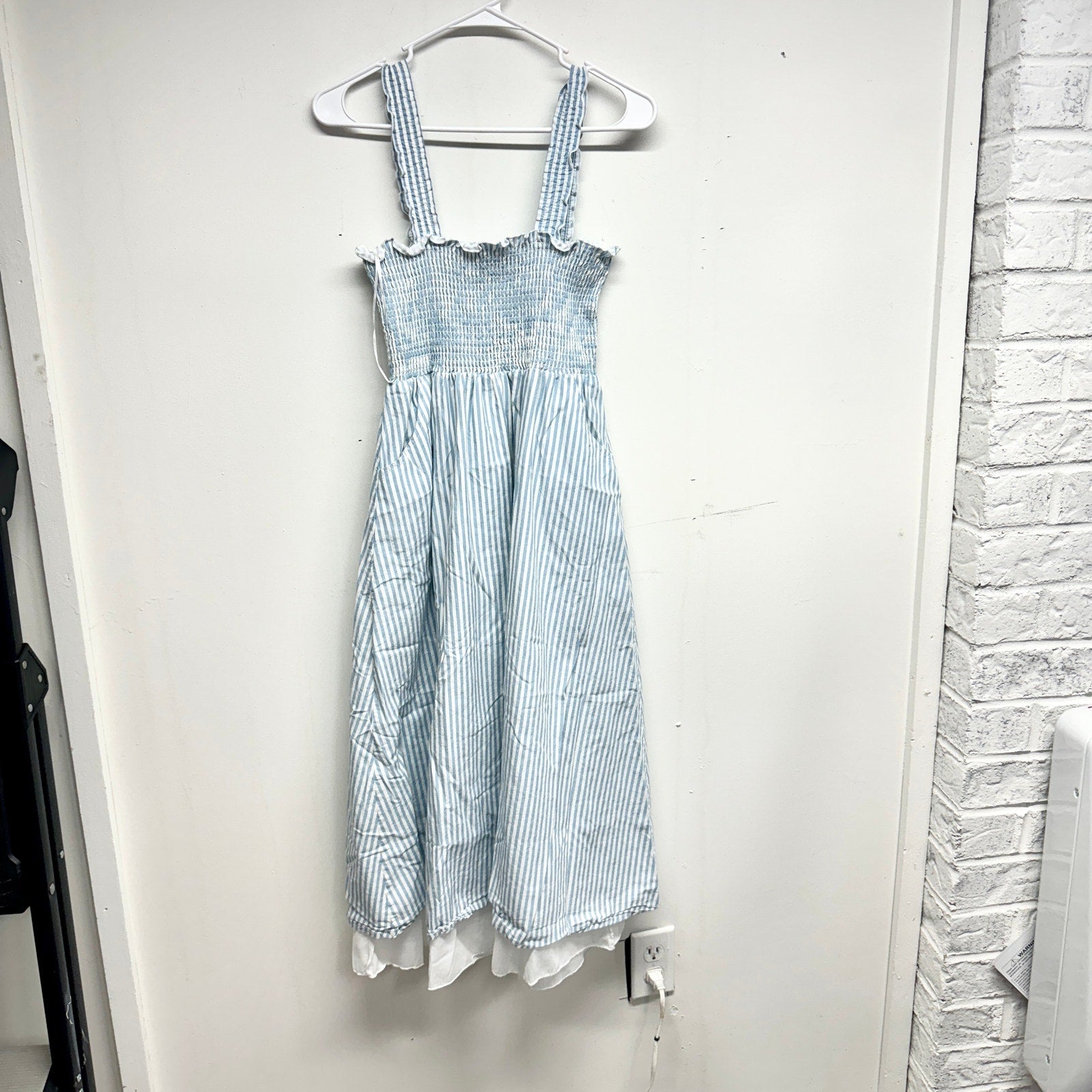 AQUA Women Striped Smocked Sleeveless Blue & White Ocean Midi Dress Small