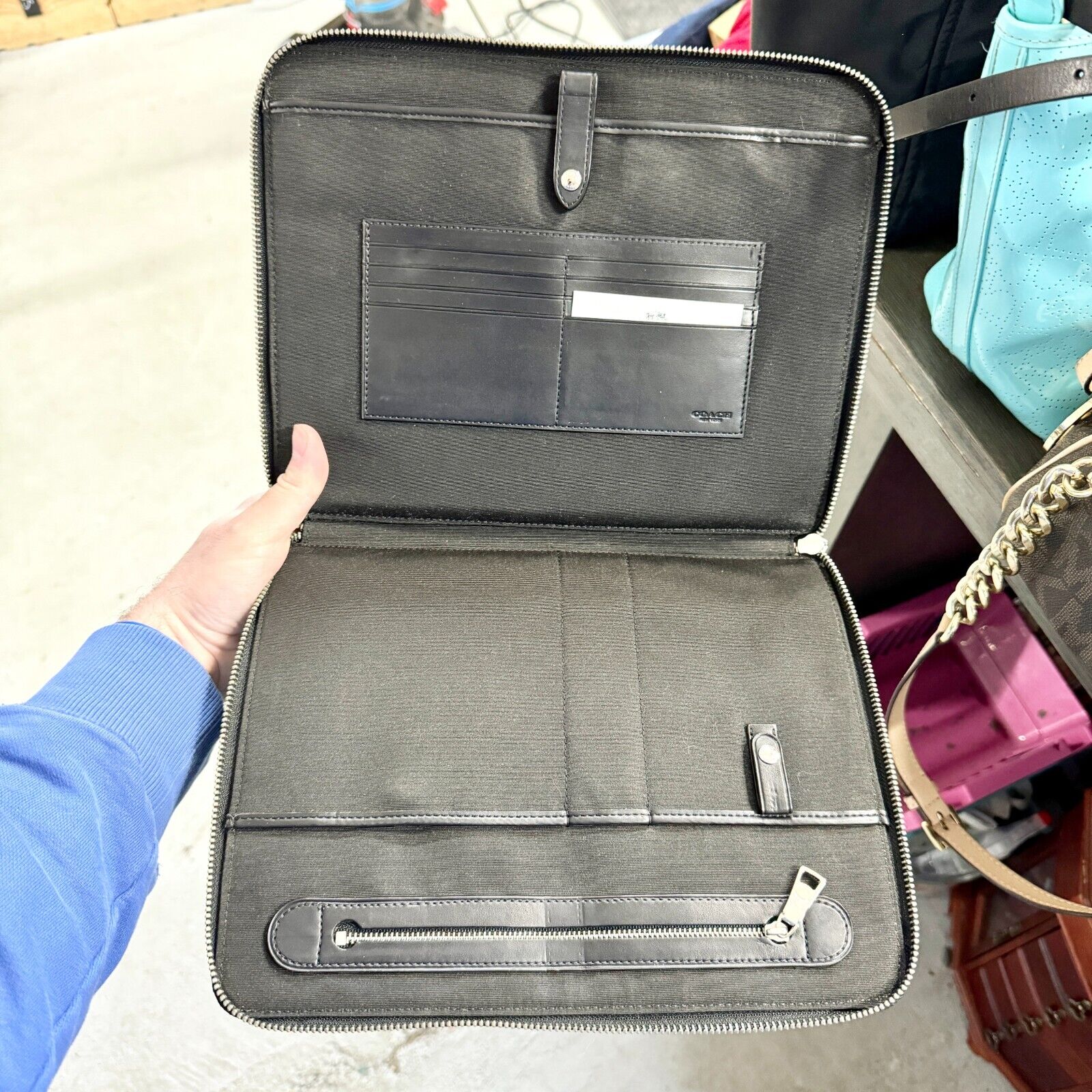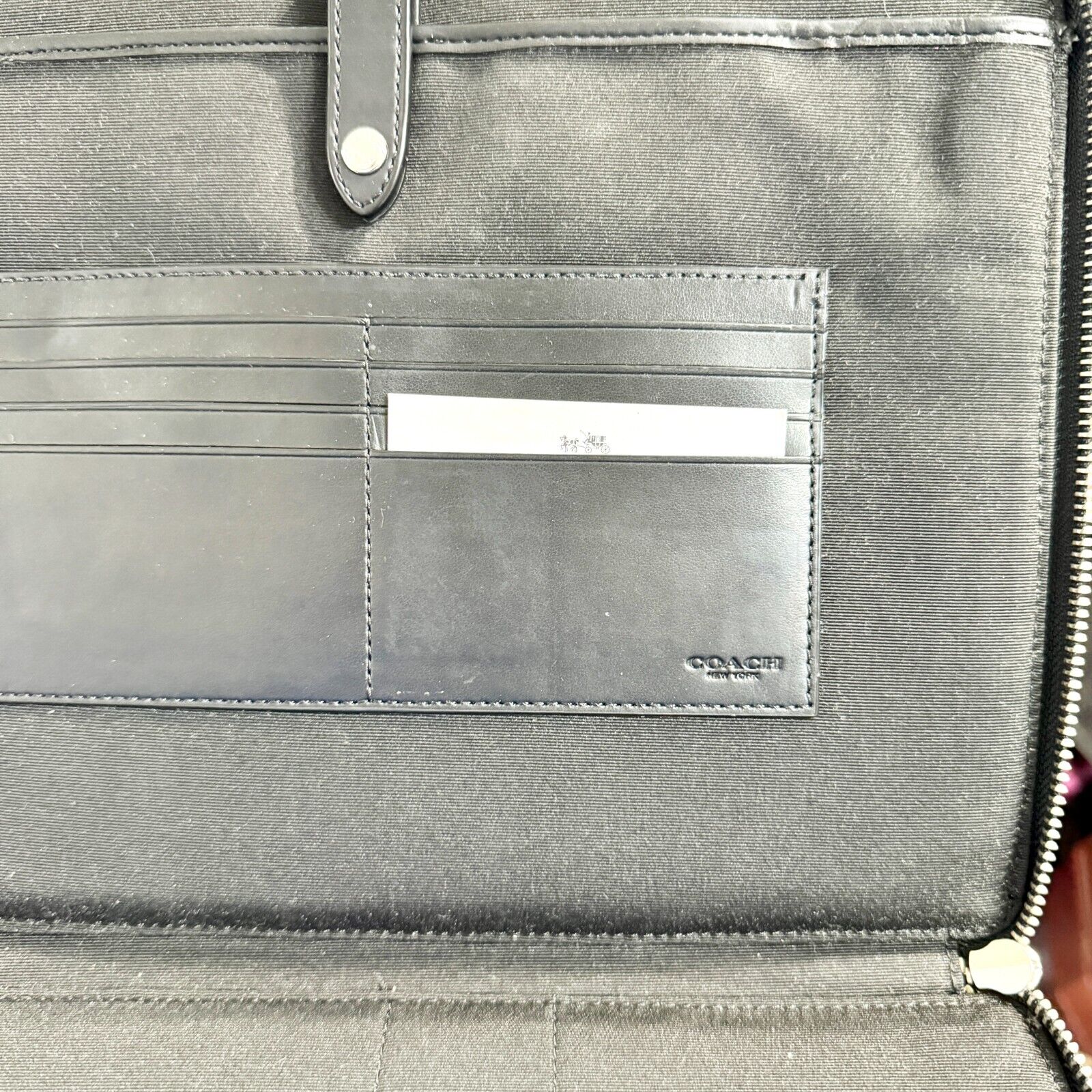 COACH Black Patterned All Around Zip Portfolio Case Luxury elegant, refined, professional, sleek, durable, compact, classic, premium, functional, sophisticated