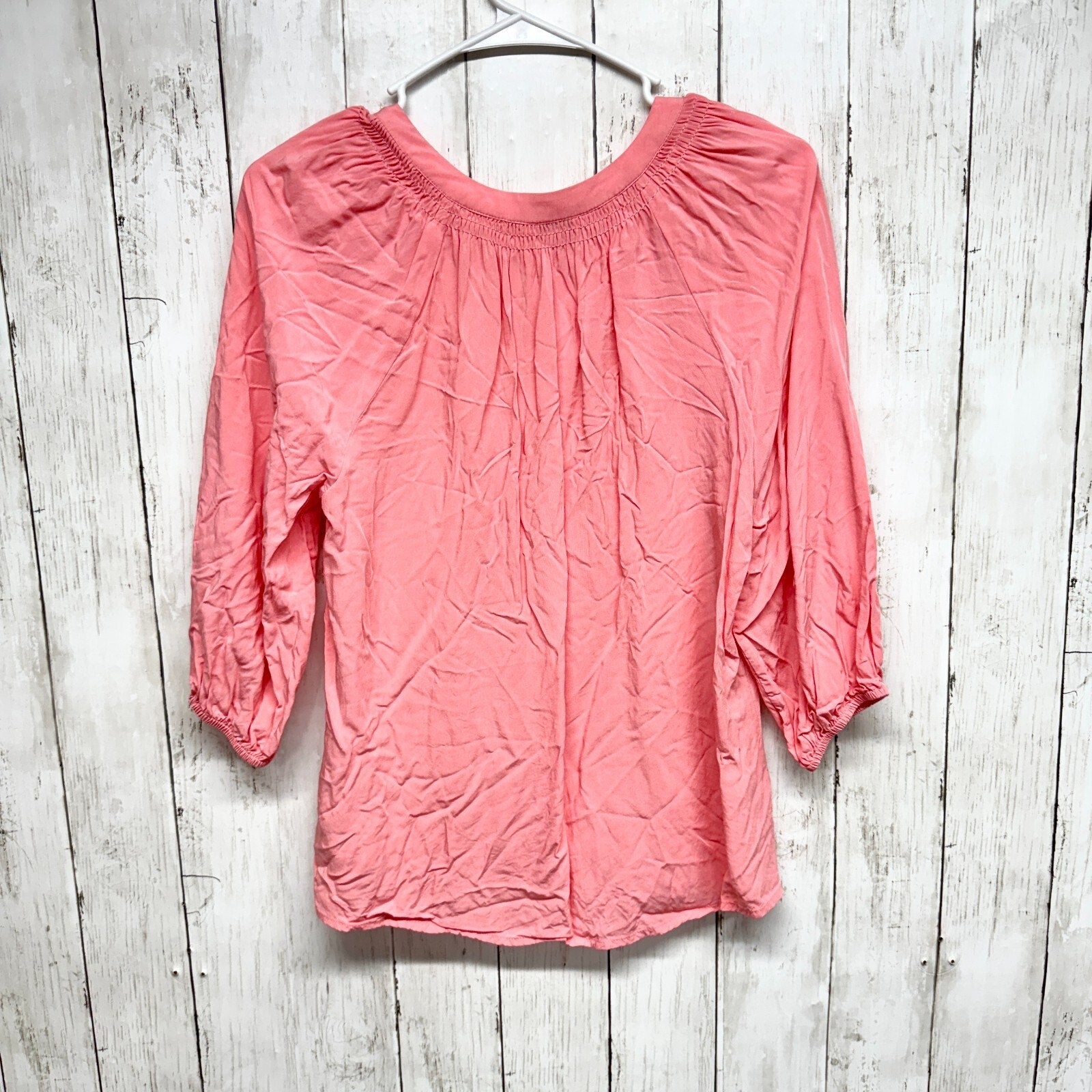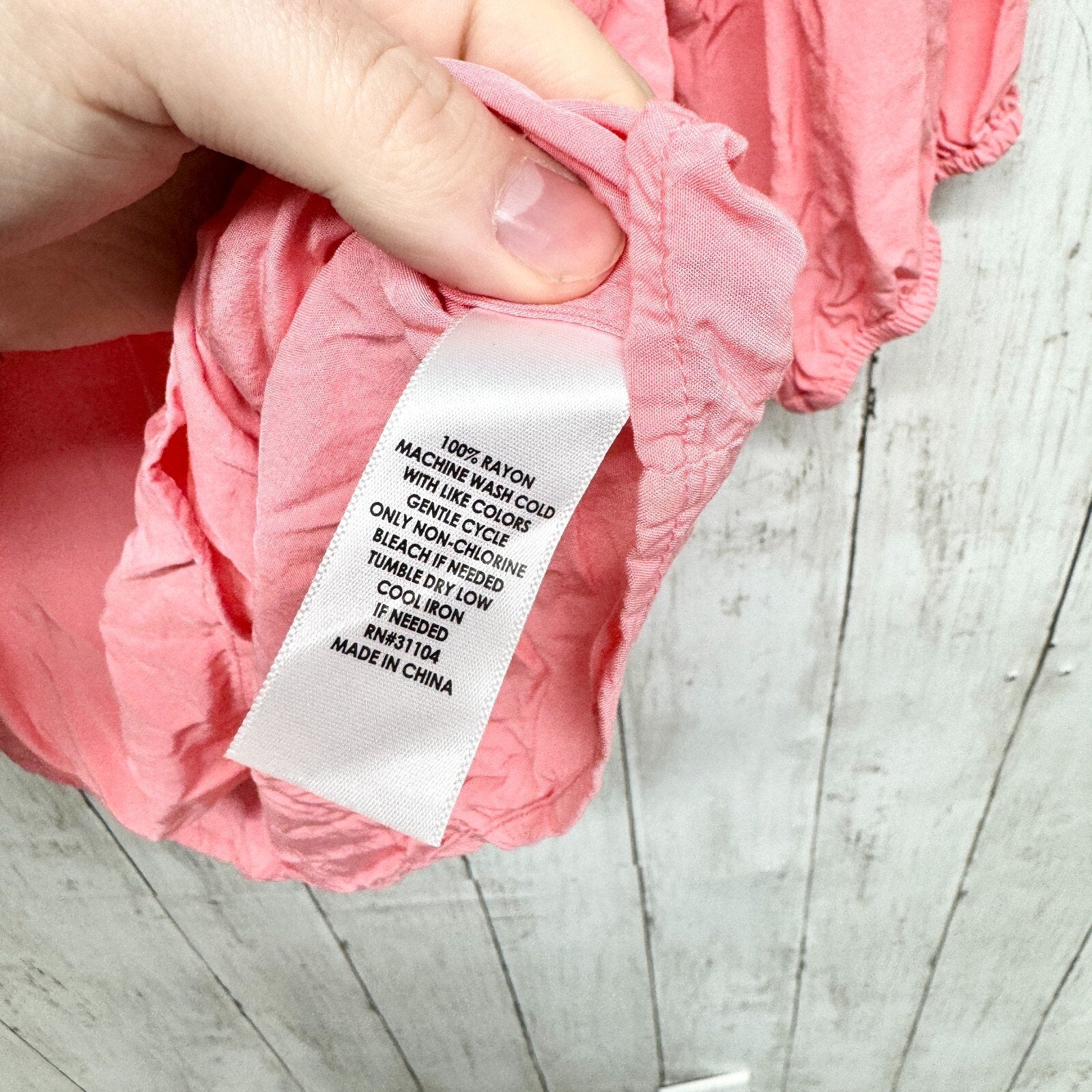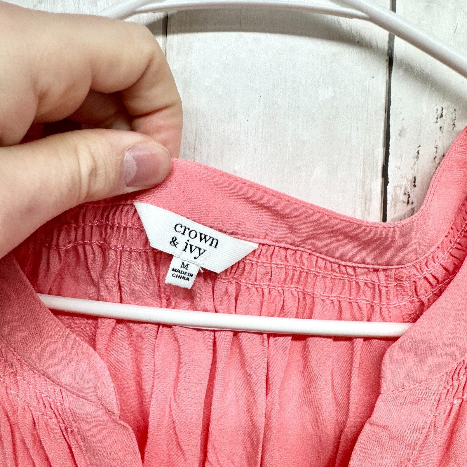 CROWN & IVY Blouse Women Size M Pink Puff Sleeve Deep V Neck Business Casual