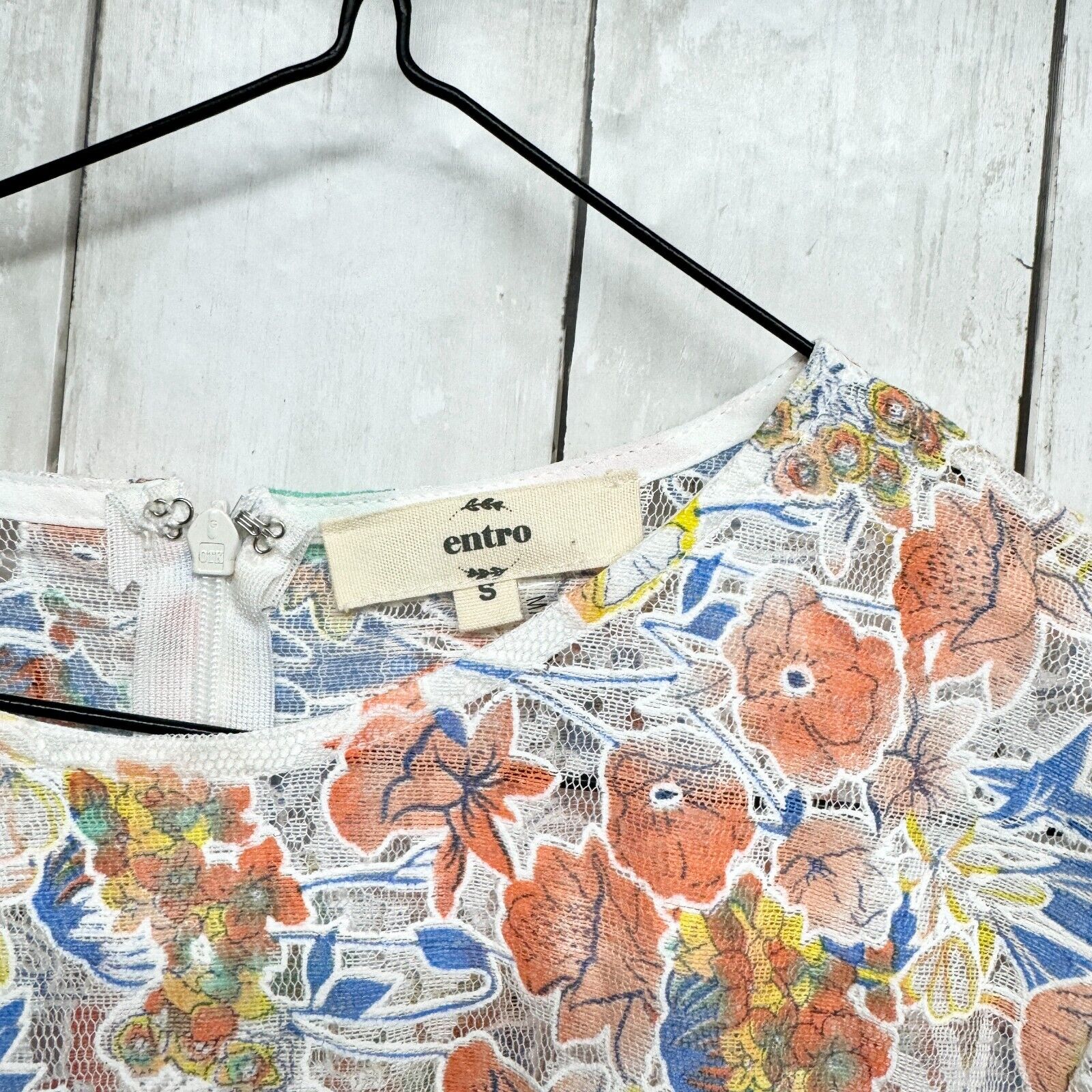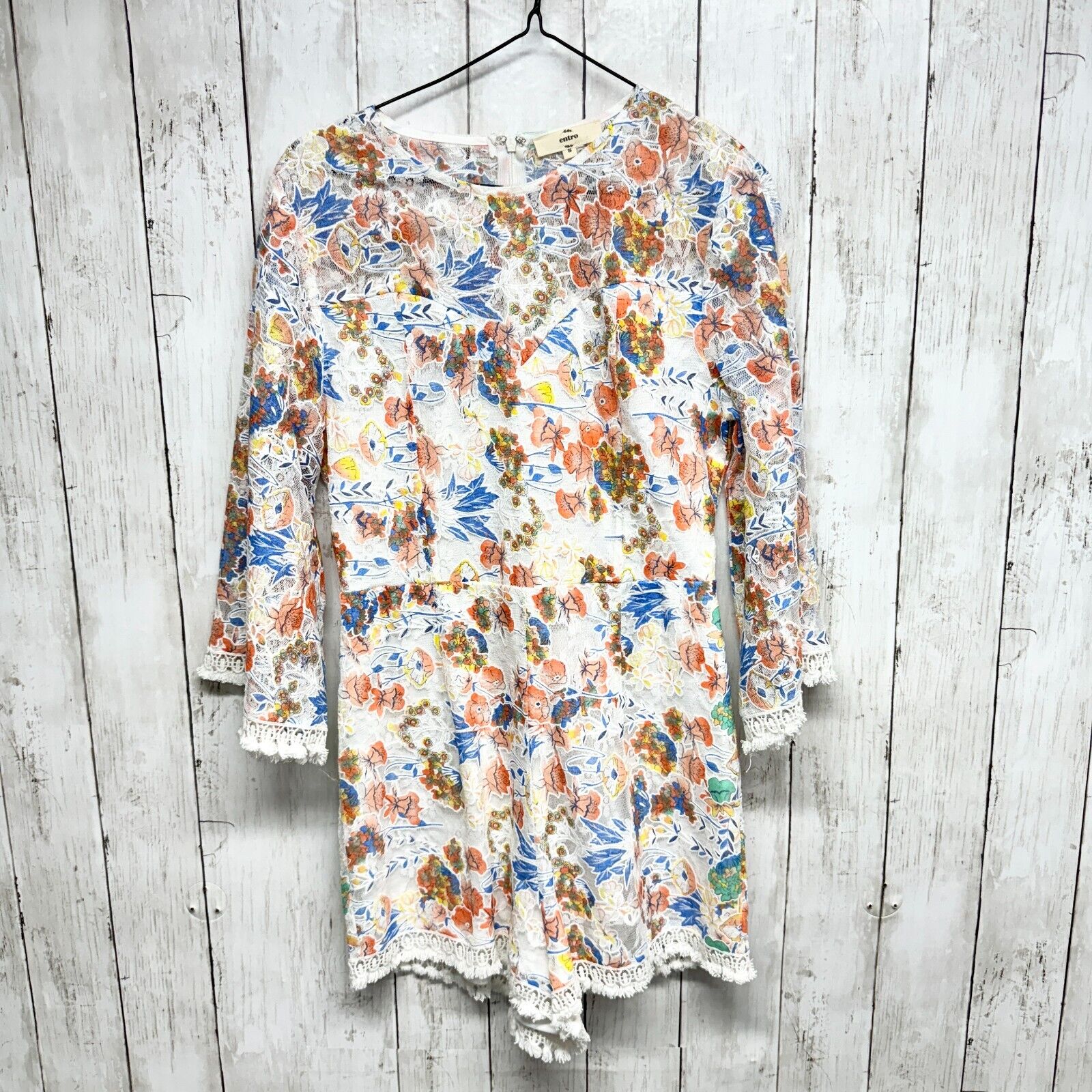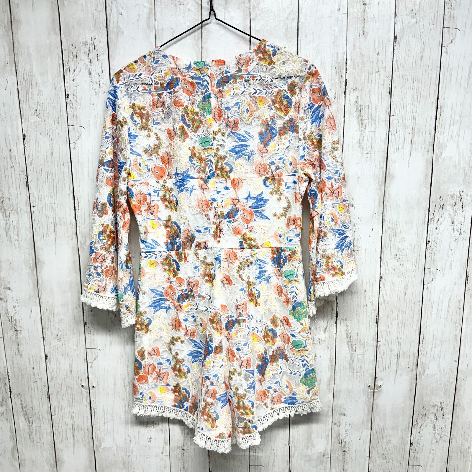 ENTRO Romper Women S White Floral Fit & Flare Ruffle Short Bell Sleeve Lace Trim Women's size S, white, floral, fit & flare, ruffle, short bell sleeve, lace trim, lightweight, feminine