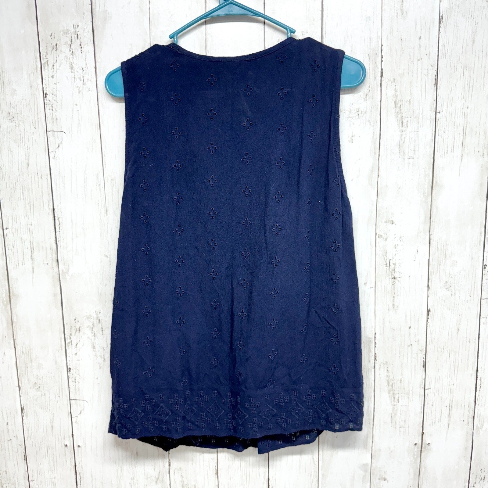 Gap Shirt Women S Tie-Front Splitneck Top Lace Trim Lasercut Navy Blue Rayon