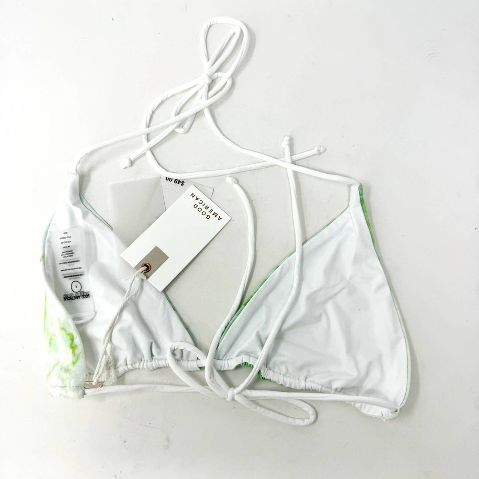 - Elevate your swimwear collection with this exquisite Good American Matte Tiny Ties Triangle Top and Tie Fixed Bottom Bikini in Size 3/Large.