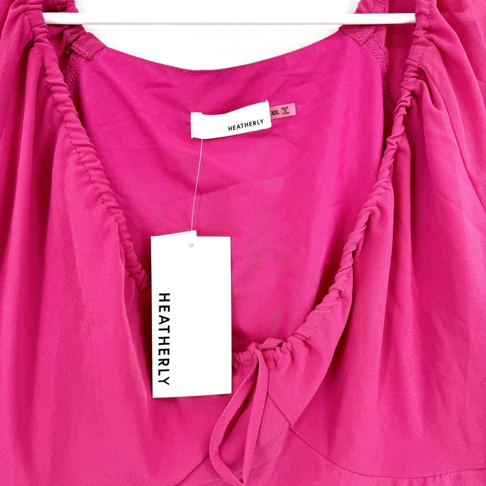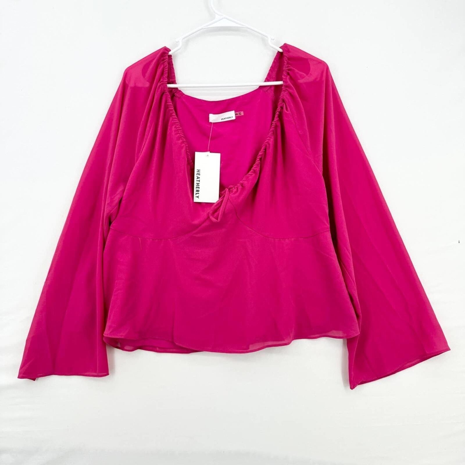 HEATHERLY Blouse Women Size XXL Hot Pink Y2K V Neck Flared Sleeve Semi Sheer apparel, top, trendy, stylish, feminine, lightweight, chic, vibrant, contemporary, casual, fashionable, relaxed, semi-sheer, flared, modern