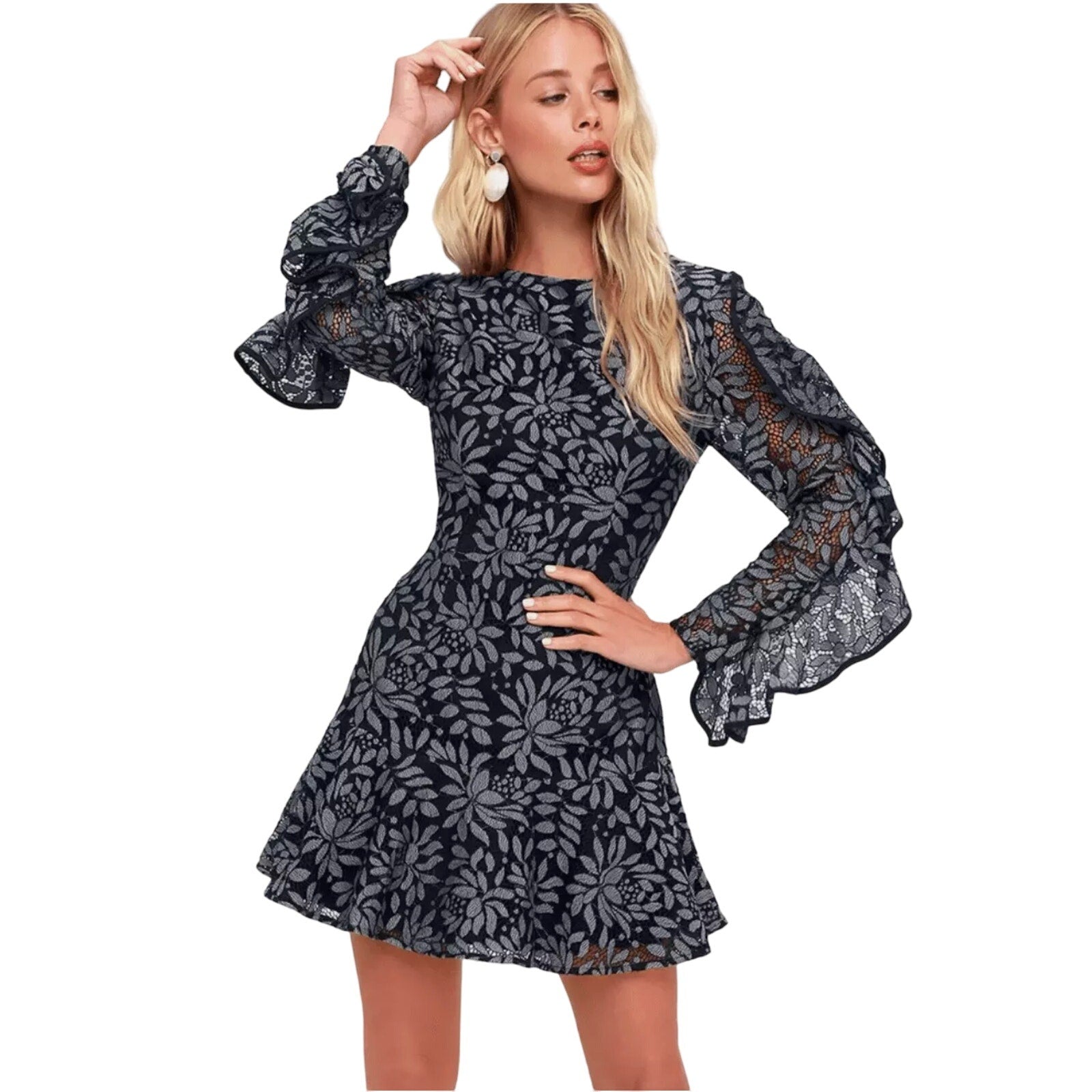 Keepsake The Label Dresses Engage Navy Blue Lace Long Sleeve Dress Small
