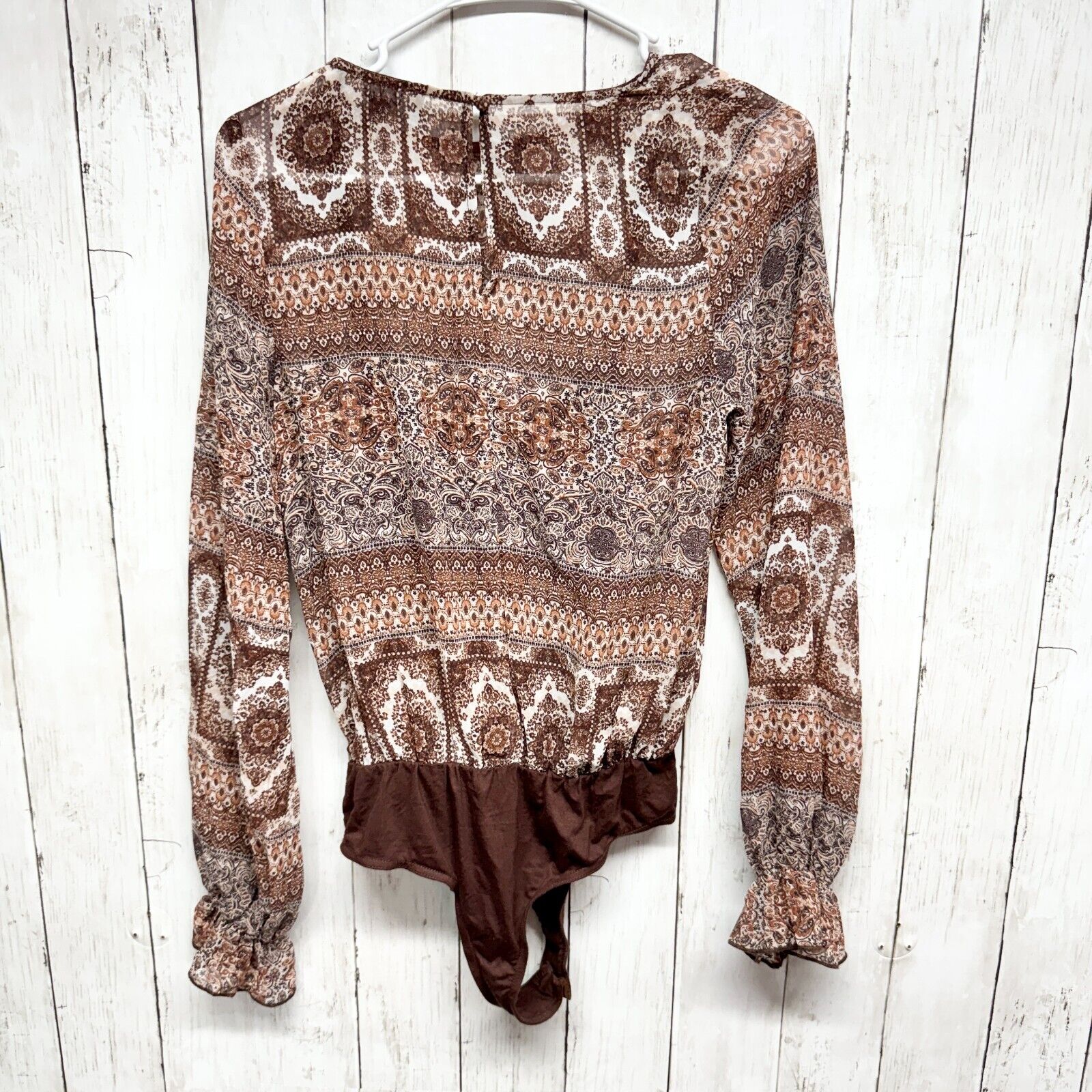 Lulus Bodysuit Women Size XS Brown Boho Tribal Long Sleeve Cuffed Crewneck