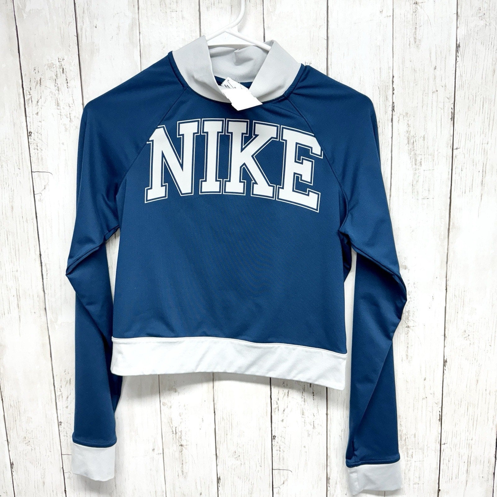 Nike Sweater Women Sz M Long Sleeve Cropped Graphic T Shirt Logo Blue Mock Neck
