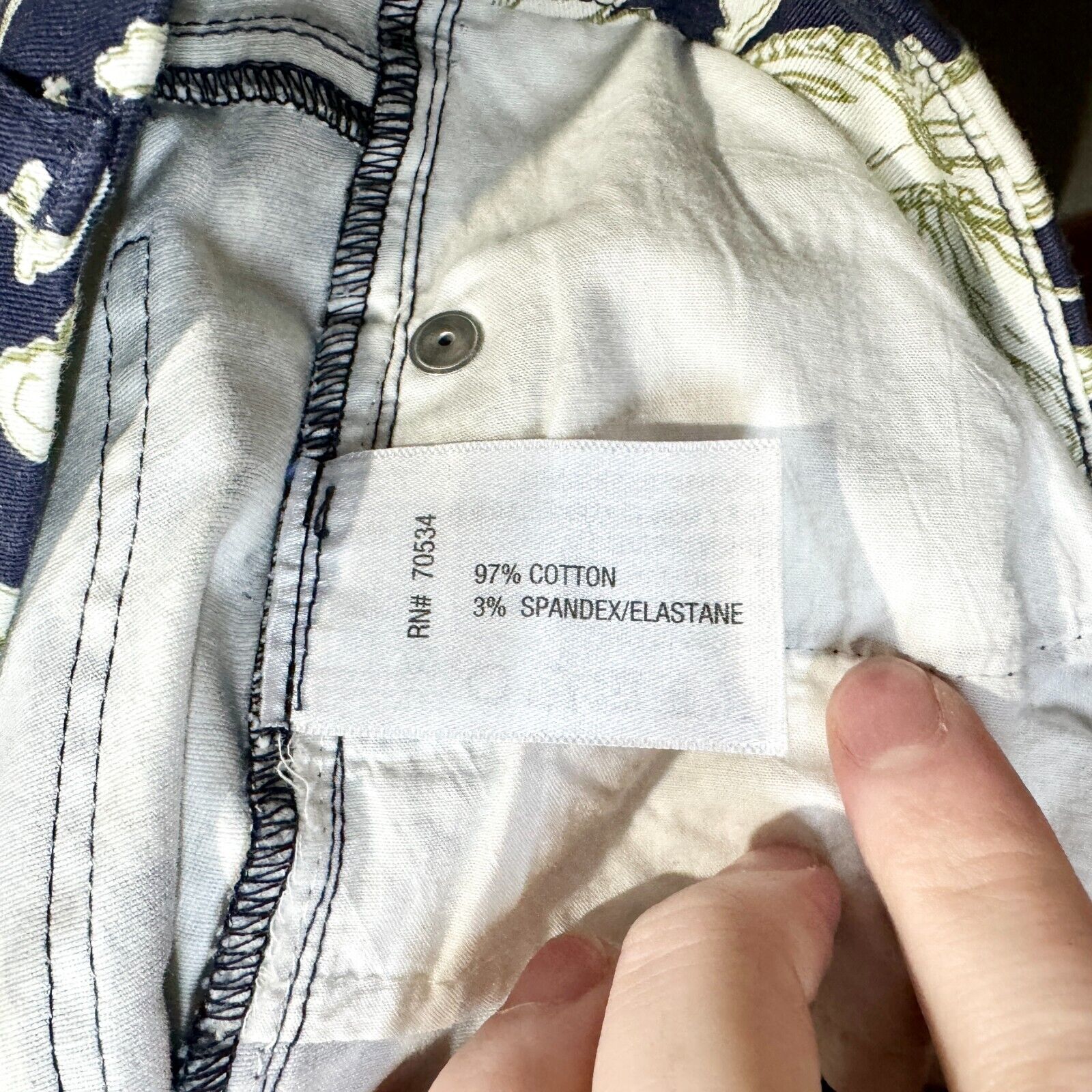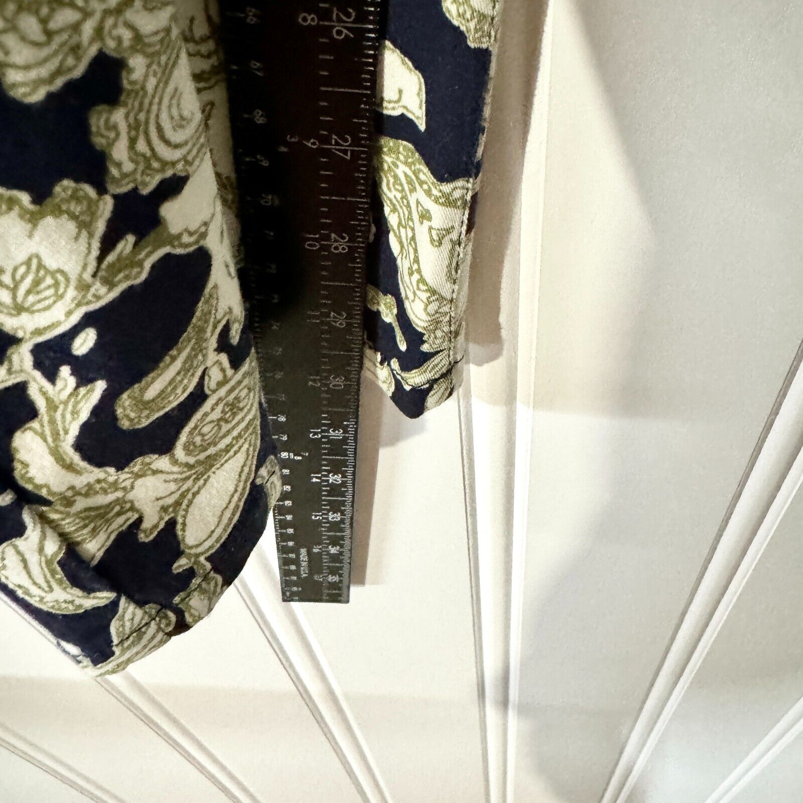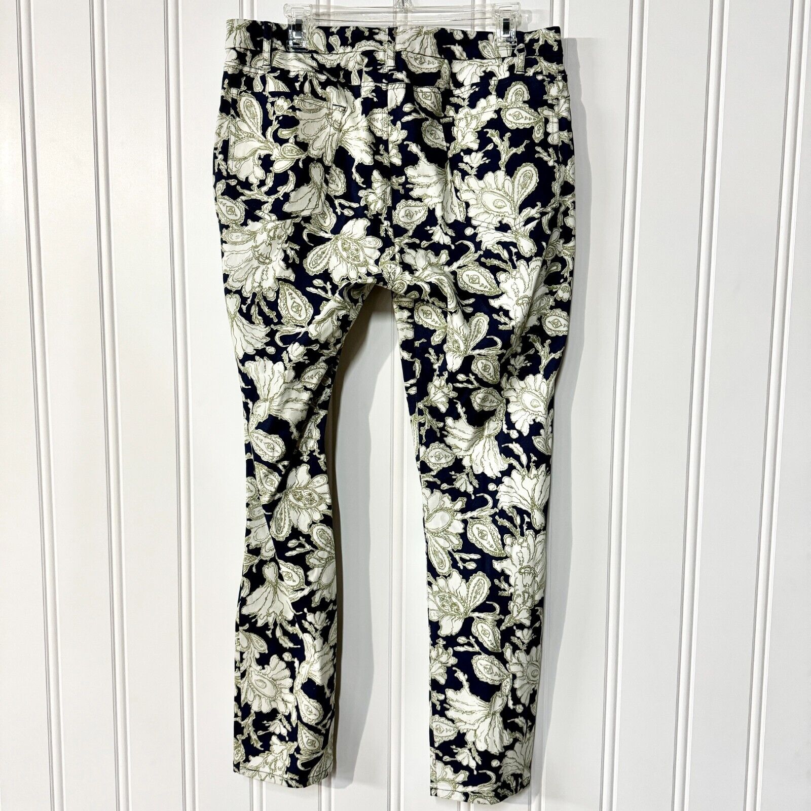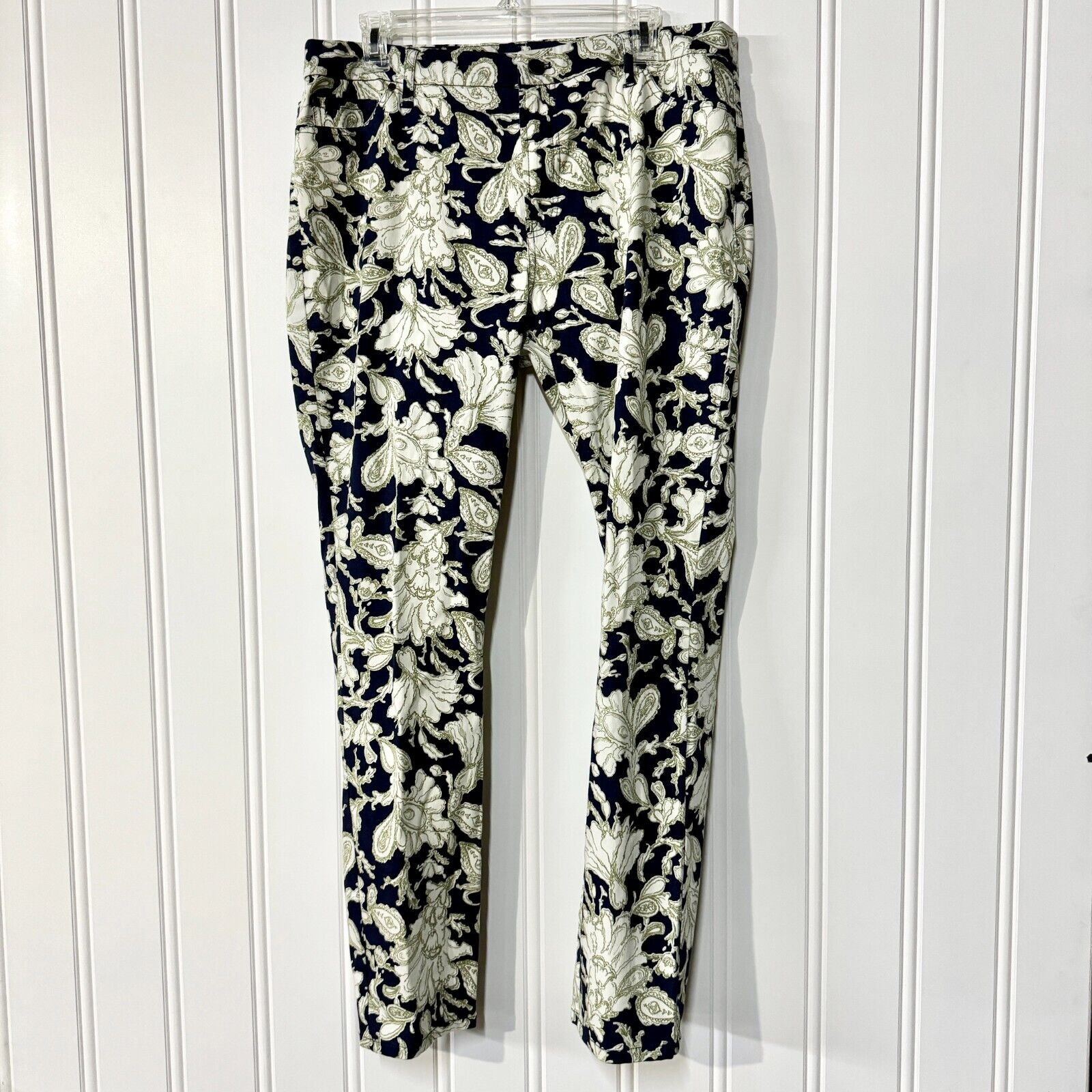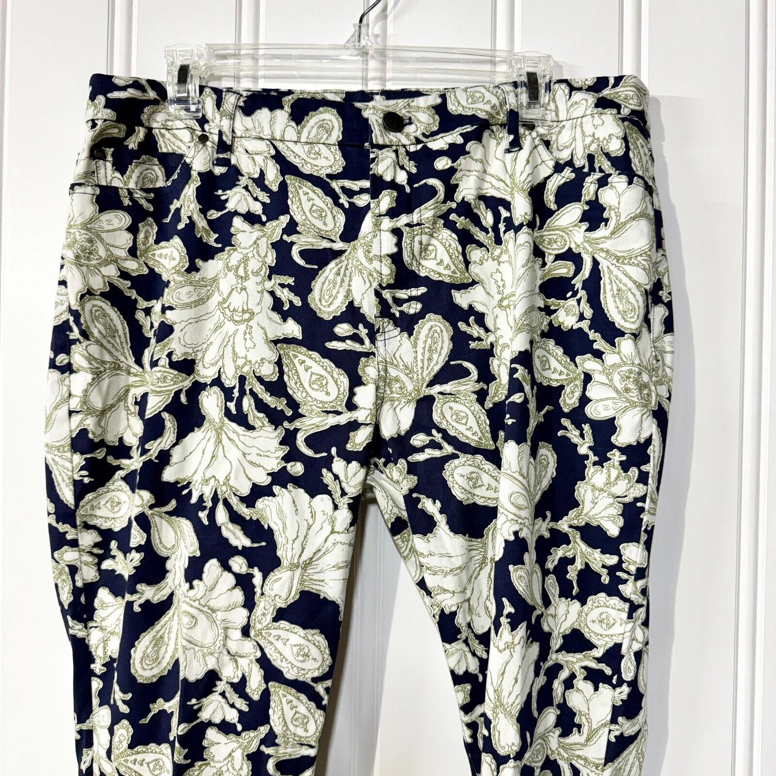 ORVIS Pants Women Size 14 Low Rise Skinny Floral Navy Blue Button Front Zip Up stylish, vibrant, fitted, stretchy, comfortable, modern, chic, casual, detailed, versatile