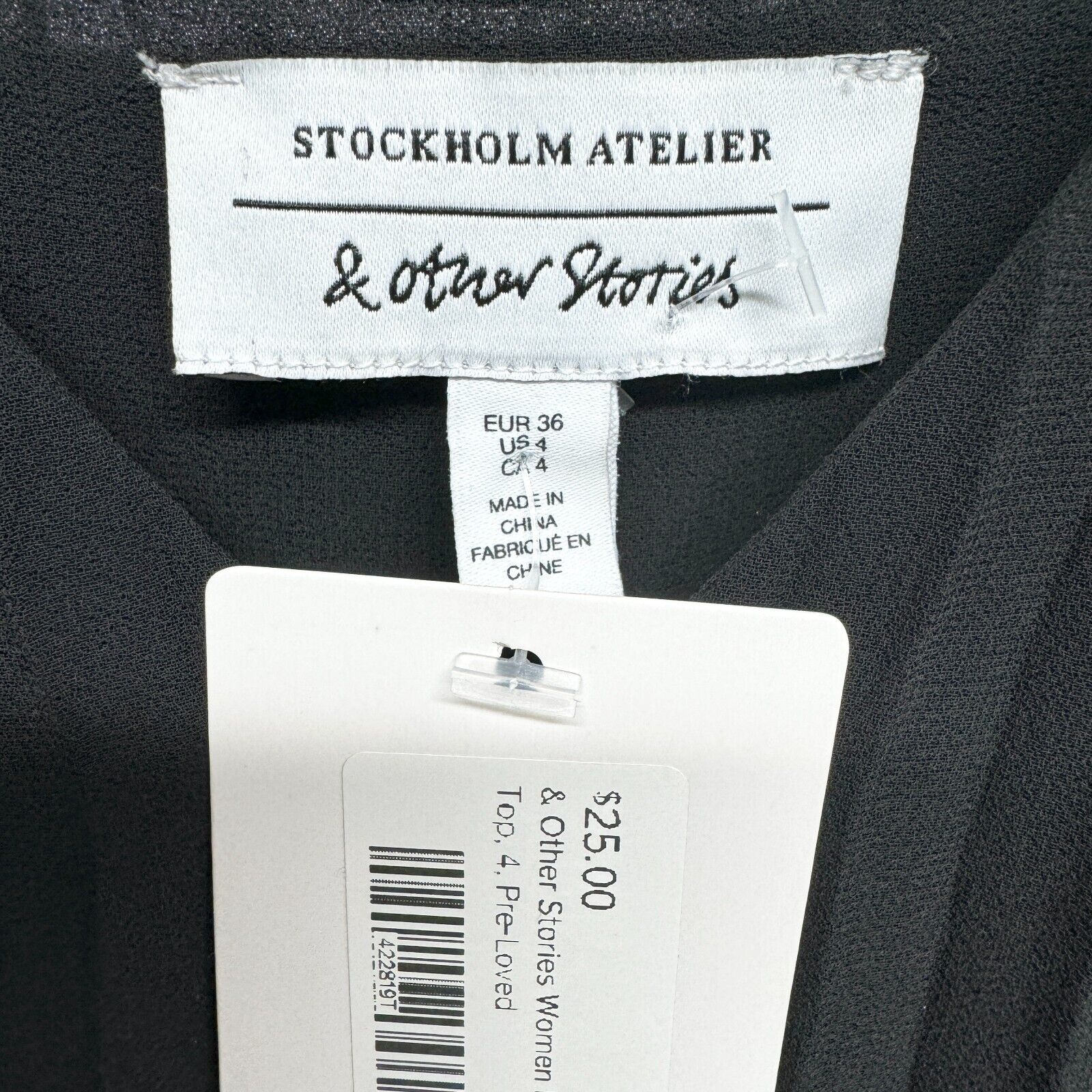 & Other Stories Tank Top Women Size 4 Asymmetrical Chiffon Pleated Black V Neck Fashion, Casual, Elegant, Stylish, Trendy, Lightweight, Feminine, Chic, Flowy, Versatile, Soft, Sleeveless, Summer, Layering, Minimalist, Statement, Evening, Classic, Modern, Breathable