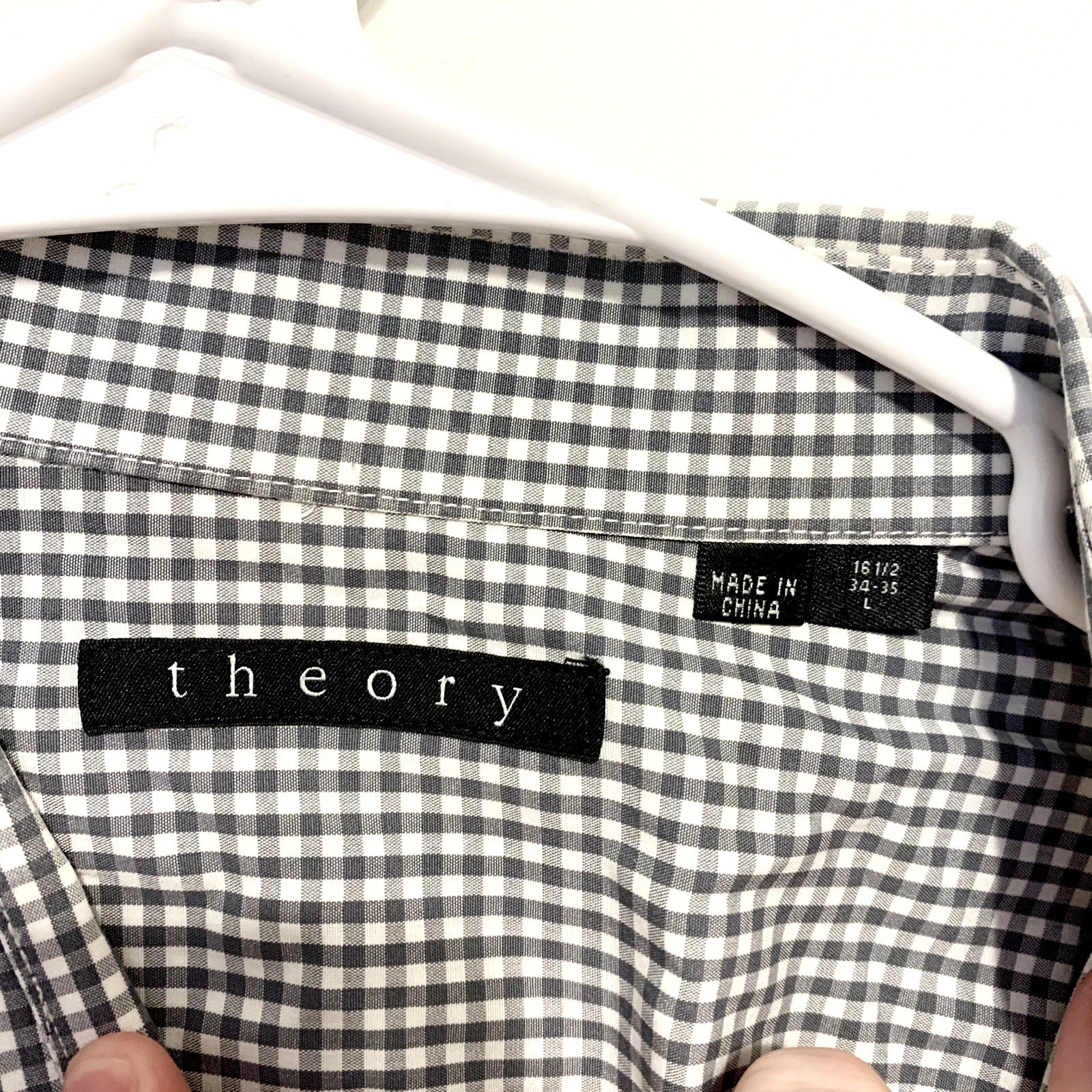 THEORY Button Up Mens Size 16.5 Grey Plaid Long Sleeve Collared Cotton Blend sleek, tailored, refined, classic, lightweight, versatile, modern, textured, breathable, polished