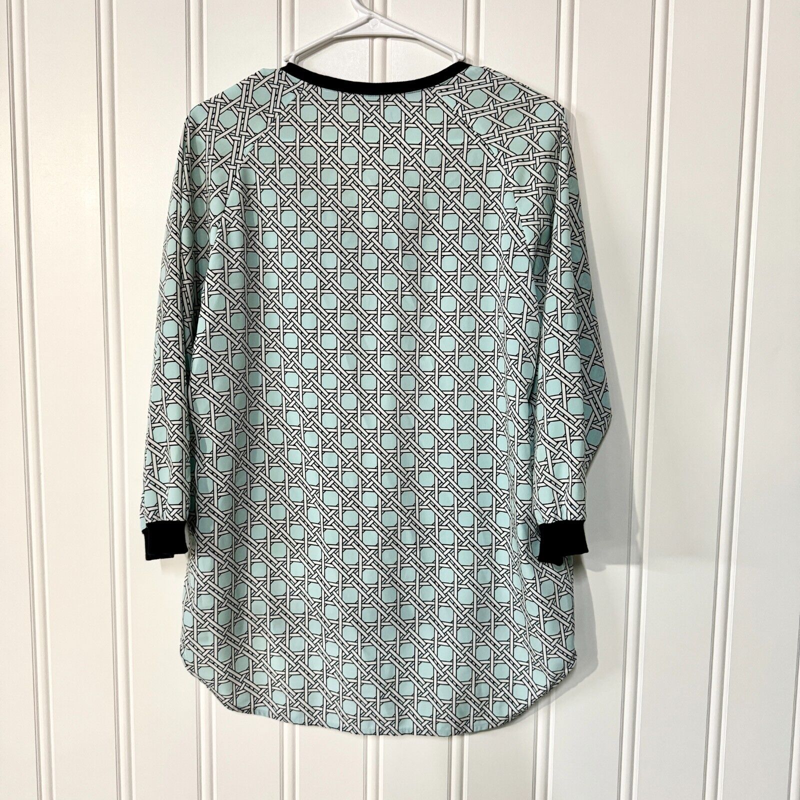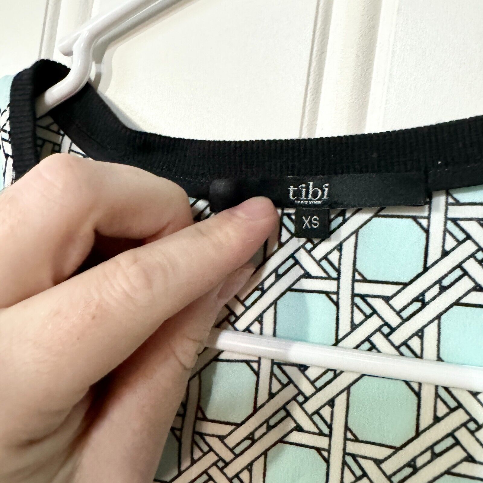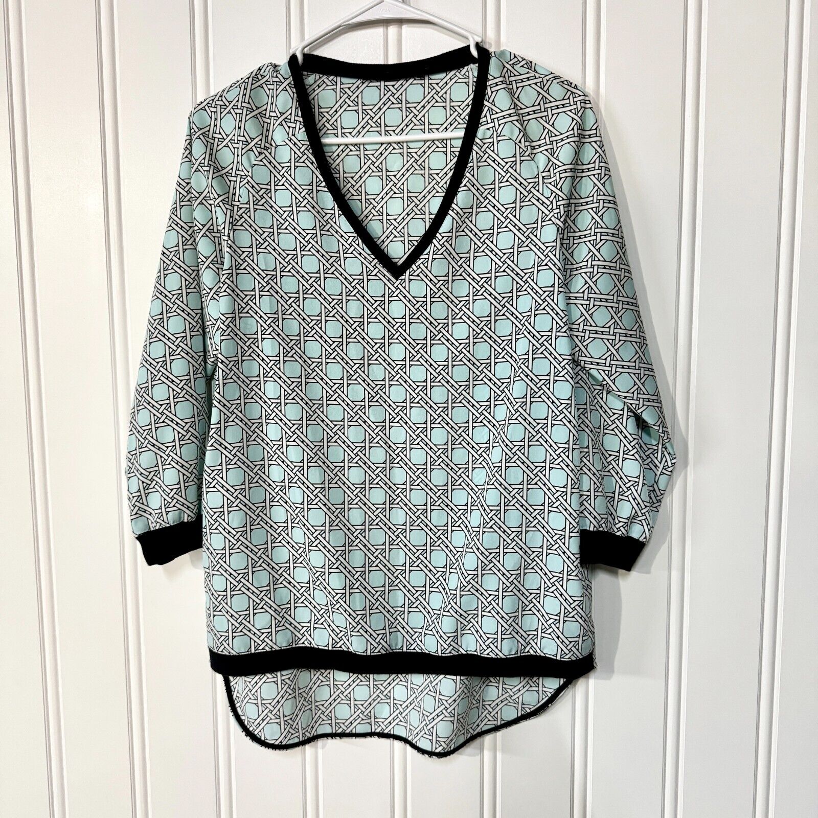 Tibi Blue Geometric High Low V Neck Polyester Black Hemmed Blouse Size XS