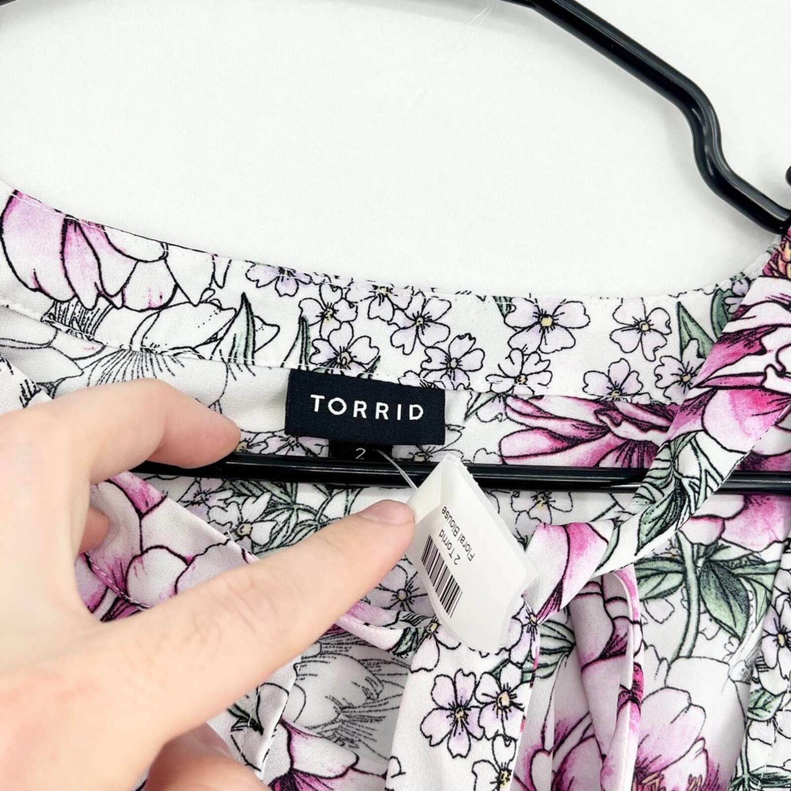 TORRID Blouse Women Size 2/XXL Pink & White Floral Hatler Neck Tied Long Sleeve apparel, top, chic, feminine, stylish, summer, trendy, lightweight, casual, floral, comfortable, elegant, vibrant, fashionable, relaxed