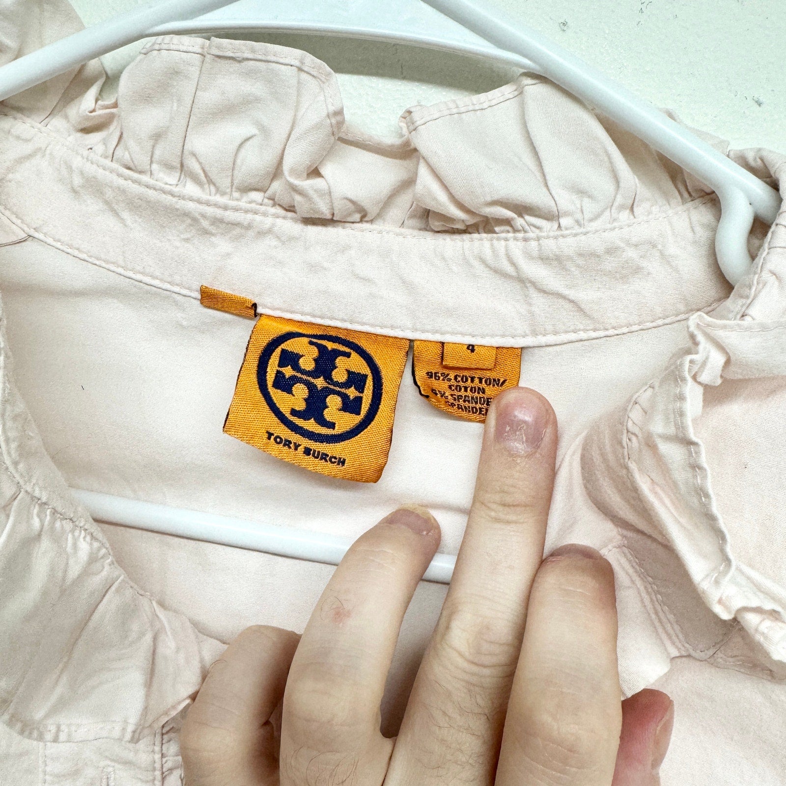 Tory Burch Women Light Pink Ruffled Neckline Long Sleeve V Neck Blouse Size 4