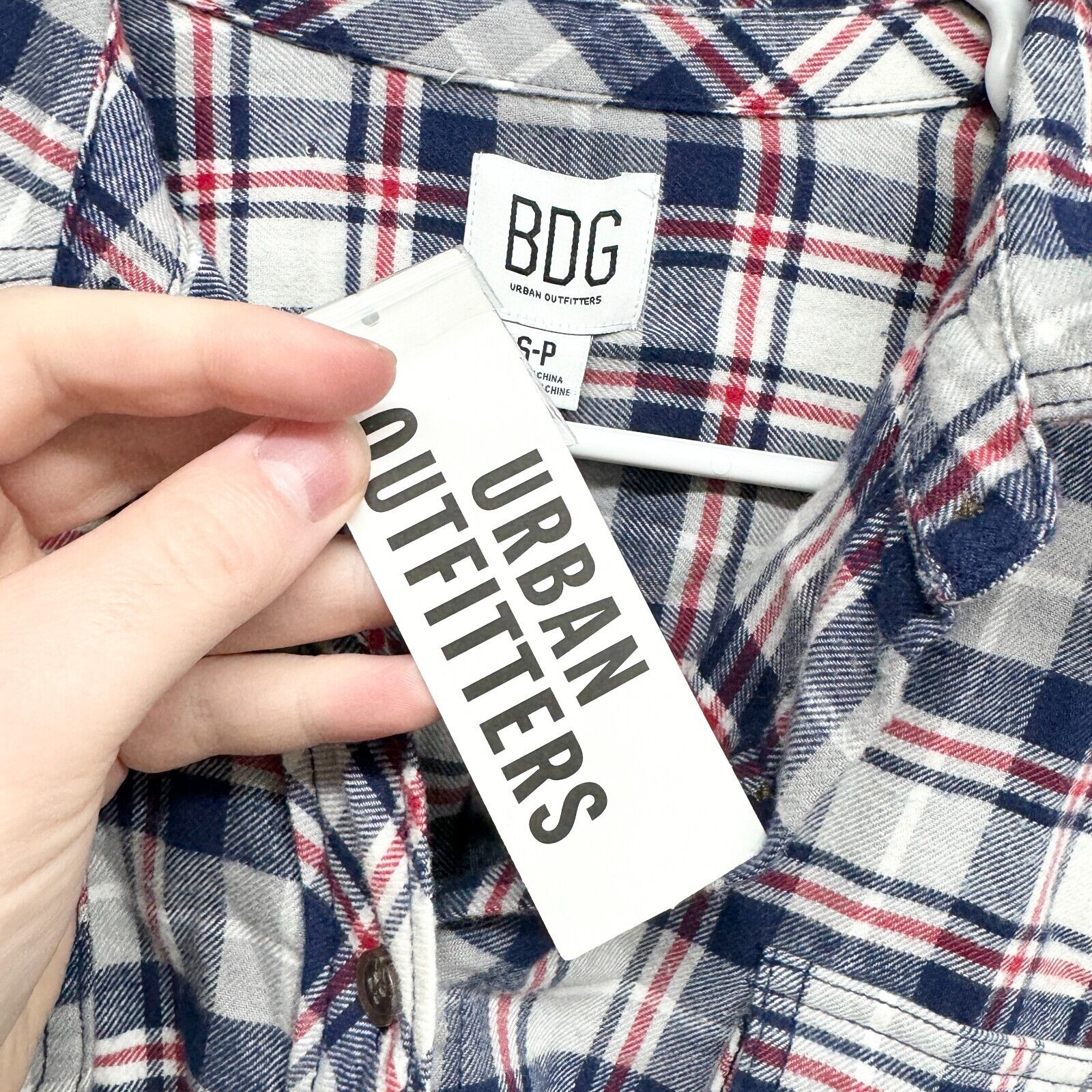 URBAN OUTFITTERS BDG Rayne Shirt Women Sz S Flannel High Low Cropped Button Blue Casual vibe, soft texture, modern cut, relaxed fit, everyday wear, versatile style