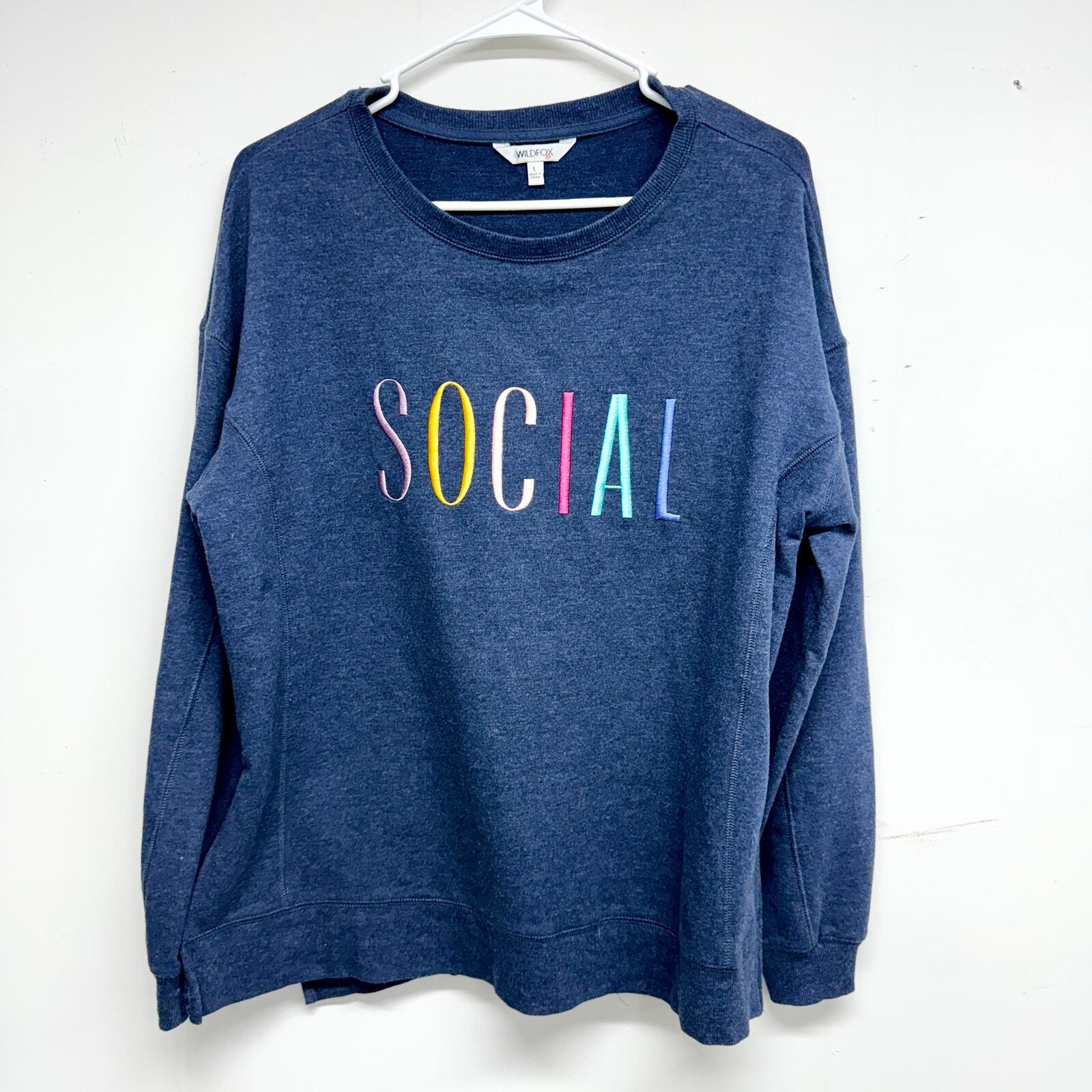 Wildfox Crewneck Pullover Dark Blue Embroidered Graphic Sweater Size Large
